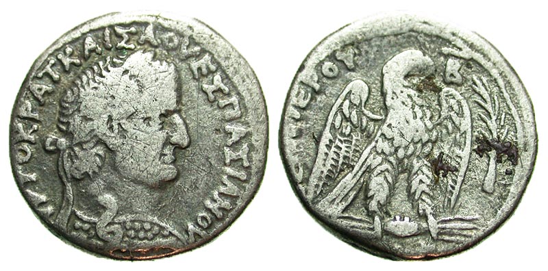 Syria, Seleucis and Pieria. Antiochia ad Orontem. Vespasian. A.D. 69-79. AR tetradrachm (25.5 mm, 13.31 g, 12 h). AVTOKPAT KAIΣA OVEΣΠAΣIANOV, laureate head right / ETOYΣ NEOY IEPOY B, eagle standing right on thunderbolt; palm branch right. RPC 1938; Prieur 105. aVF, Rare.