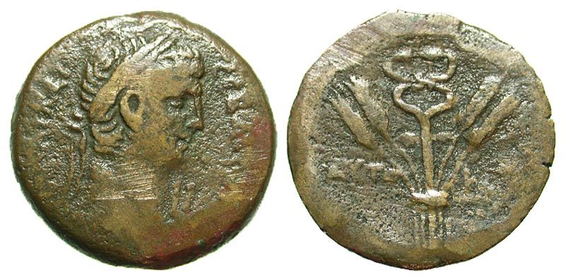 Egypt, Alexandria. Claudius. A.D. 41-54. Æ diobol (24.7 mm, 8.50 g, 1 h). Year 11 = A.D. 50-51. TIB KΛAV KAI CEBAC ΓEPM, LIA, laureate head right / AVTO-KPA, winged caduceus between four grain ears. Milne 119; Emmett 78; RPC 5182. aVF.
