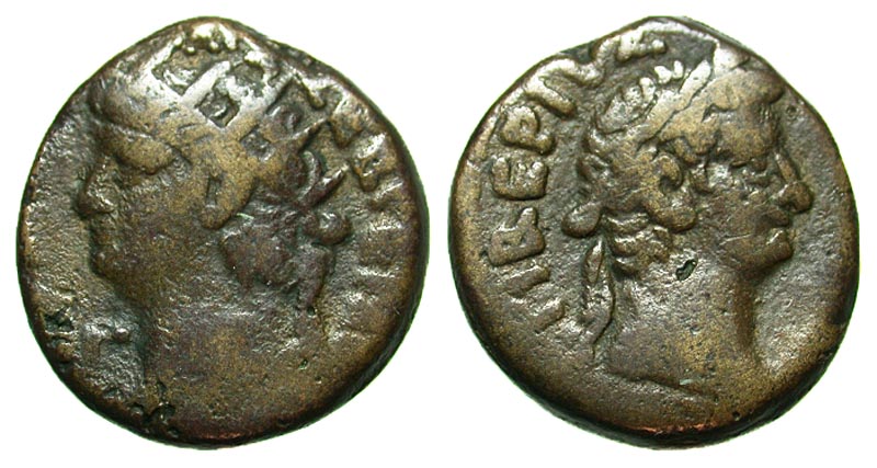 Egypt, Alexandria. Nero. A.D. 54-68. AR tetradrachm (23.7 mm, 11.41 g, 1 h). Year 13 = A.D. 66-67. NEPΩ KΛAVΔAIΣ ΣEB ΓEP AV, LIΓ, radiate head left, wearing aegis / TIBEPIOΣ KAIΣAP, laureate head of Tiberius right. Milne 256; Emmett 134; RPC 5295. aVF.