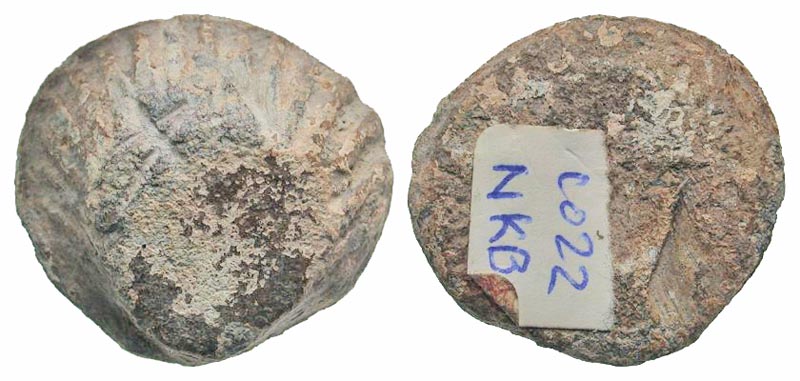 Anonymous. 4th-3rd century B.C. PB cast aes formatum (31x28x10 mm, 42.88 g). Cast lead in the form of a cockle shell. Thurlow & Vecchi p. 20; Burgos P.29.