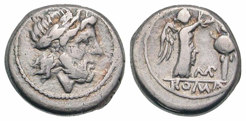 Anonymous [MP]. Ca. 211-208 B.C. AR victoriatus (15.9 mm, 3.26 g, 10 h). Uncertain mint. Laureate head of Jupiter right / ROMA, Victory standing right, crowning trophy; MP monogram between. Crawford 93/1b; Sydenham 111; RSC 36h. VF. Rare.