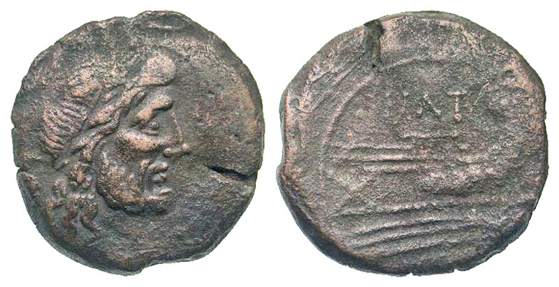 Pinarius Natta. 155 B.C. AE semis (27.5 mm, 11.36 g, 10 h). Rome mint. Laureate head of Saturn right, S behind / NAT / ROMA, prow of galley right, S before. Crawford 200/3; Sydenham 383a. Fine, rough. Very Rare.