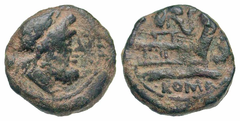 Anonymous. 128 B.C. AE semis (22.4 mm, 7.03 g, 11 h). Rome mint. Laureate head of Saturn right; S behind / ROMA, prow of galley right; S to right, elephant head above. Crawford 262/2; Sydenham 497. Fine, sandy patina.