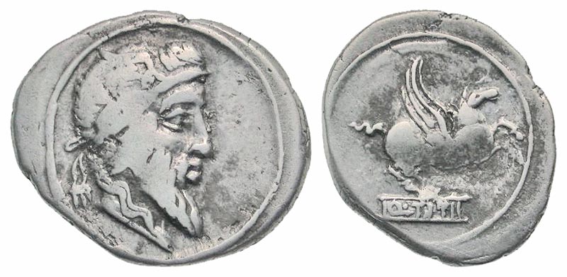 Q. Titius. 90 B.C. AR denarius (21.4 mm, 3.68 g, 9 h). Rome mint. Bearded bust of Mutinus Titinus right, wearing winged diadem / Q·TITI, Pegasus springing right from tablet. Crawford 341/1; Sydenham 691; RSC Titia 1. Fine.