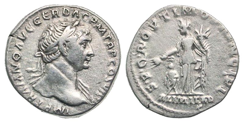 Lot 50-129. Trajan. A.D. 98-117. AR denarius. Rome mint, struck A.D. 112-115.