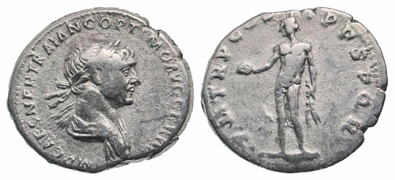 Lot 50-131. Trajan. A.D. 98-117. AR denarius. Rome mint, struck A.D. 114-117.