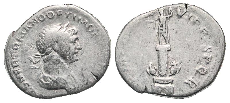 Lot 50-132. Trajan. A.D. 98-117. AR denarius. Rome mint, struck A.D. 114-115.