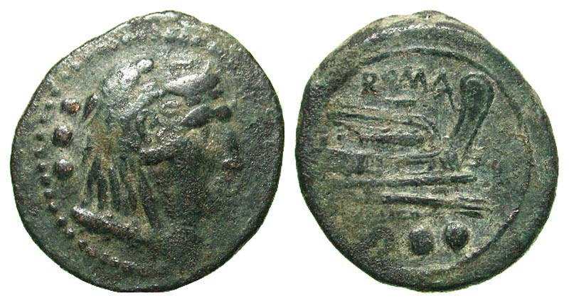 Anonymous. after 211 B.C. Æ quadrans (22.2 mm, 6.01 g, 12 h). Uncertain mint. Head of Hercules right, earing lion's-skin headdress; three pellets behind / ROMA, pro of galley right; three pellets belo. Craford 56/5; Sydenham 143c. VF, green highlights.