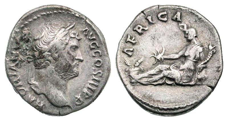 Hadrian. A.D. 117-138. AR denarius (18.7 mm, 2.97 g, 6 h). Rome mint, struck A.D. 134-138. HADRIANVS AVG COS III P P, laureate head right / AFRICA, Africa, holding scorpion and cornucopia, reclining left; basket of grain ears at left. RIC 299; BMCRE 816; RSC 138. aVF.