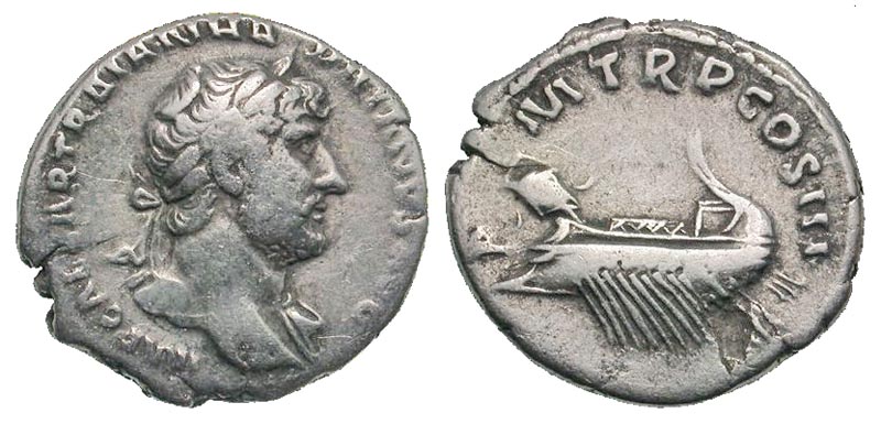 Hadrian. A.D. 117-138. AR denarius (18.3 mm, 3.01 g, 6 h). Rome mint, struck A.D. 118. IMP CAESAR TRAIANVS HADRIANVS AVG, laureate head right, draped left shoulder / P M TR P COS III, galley left, with mast, oars and cabin. RIC 113; RSC 1174a. aVF.