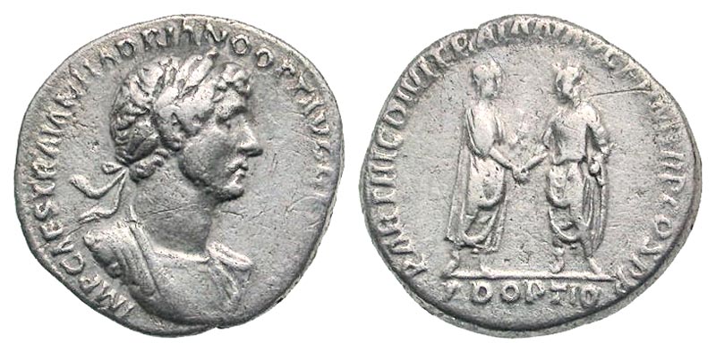 Hadrian. A.D. 117-138. AR denarius (18.2 mm, 2.94 g, 7 h). Rome mint, struck A.D. 117. IMP CAES TRAIAN HADRIANO OPT AVG GER DAC, laureate, draped, and cuirassed bust right / PARTHIC DIVI TRAIAN AVG F P M TR P COS P P, ADOPTIO, Trajan and Hadrian standing facing, clasping hands. RIC 3c; BMCRE 6; RSC 4a. aVF. Rare type.