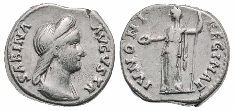 Lot 50-142. Sabina. Augusta, A.D. 128-136/7. AR denarius. Rome mint, struck A.D. 134-136.