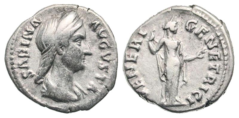 Lot 50-143. Sabina. Augusta, A.D. 128-136/7. AR denarius. Rome mint, struck A.D. 134-136. Rare.