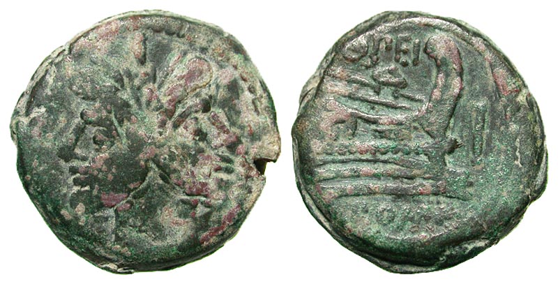 Q. Opimius. Ca. 169-158 B.C. Æ as (31.9 mm, 28.31 g, 11 h). Uncial standard. Rome. Laureate head of bearded Janus; I above / OPEI / ROMA, Pro of galley right; I to right. Craford 190/1; Sydenham 363. VF, mottled patina.