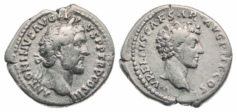 Lot 50-144. Antoninus Pius, with Marcus Aurelius, as Caesar. A.D. 138-161. AR denarius. Rome mint, ca. A.D. 141-143.