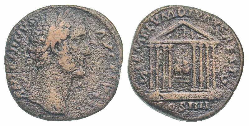 Antoninus Pius. A.D. 138-161. AE sestertius (31.6 mm, 21.82 g, 11 h). Rome mint, struck A.D. 145-161. ANTONINVS AVG PIVS P P, laureate head right / TEMPLVM DIV AVG REST, COS IIII, S-C, octastyle temple with statues of Divus Augustus and Julia Augusta seated facing within, group of three figures in the pediment, star and figure holding cornucopiae at the corners. RIC 787; BMCRE 1718 var (quadriga in pediment). aVF, porous. Rare.