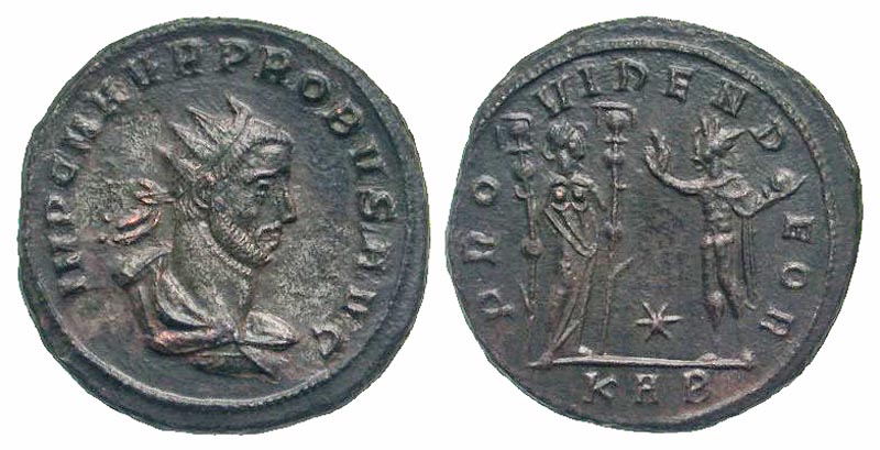 Probus. A.D. 276-282. AE antoninianus (23.2 mm, 4.21 g, 1 h). Serdica mint, struck A.D. 276. IMP C M AVR PROBVS AVG, radiate, draped, and cuirassed bust right / PROVIDEN DEOR, Providentia standing right, holding two ensigns, facing Sol standing left, right hand raised, left holding globe; star in field, KAB in exergue. RIC 845. VF.