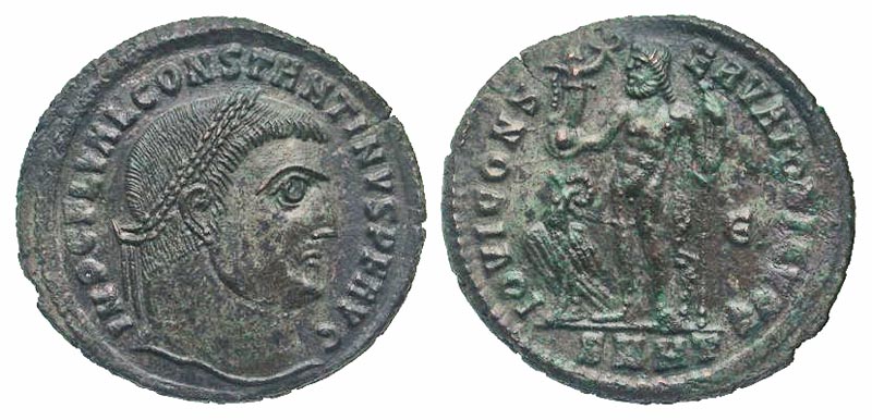 Constantine I. A.D. 307/10-337. AE follis (23.8 mm, 3.87 g, 11 h). Heraclea mint, struck A.D. 313. IMP C FL VAL CONSTANTINVS PF AVG, laureate head right / IOVI CONSERVATORI AVGG, Jupiter standing facing, head left, chlamys draped from shoulder, holding Nike and scepter, eagle with wreath at his feet; Є in right field, SMHT in exergue. RIC 75. VF.