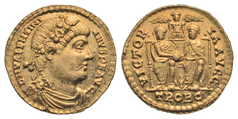 Lot 50-183. Valentinian I. A.D. 364-375. AV solidus. Trier mint, struck A.D. 374-375. Rare type.
