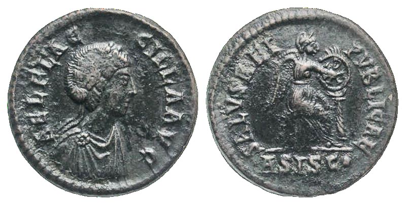 Aelia Flaccilla. Augusta, A.D. 379-386/8. AE 2 (23.2 mm, 5.29 g, 6 h). Siscia mint, struck A.D. 383-384. AEL FLACCILLA AVG, pearl-diademed and draped bust right / SALVS REIPVBLICAE, Victory seated right, inscribing Chi-Rho onto shield set on column; ASISCĀ· in exergue. RIC 34.1; LRBC 1560. VF.