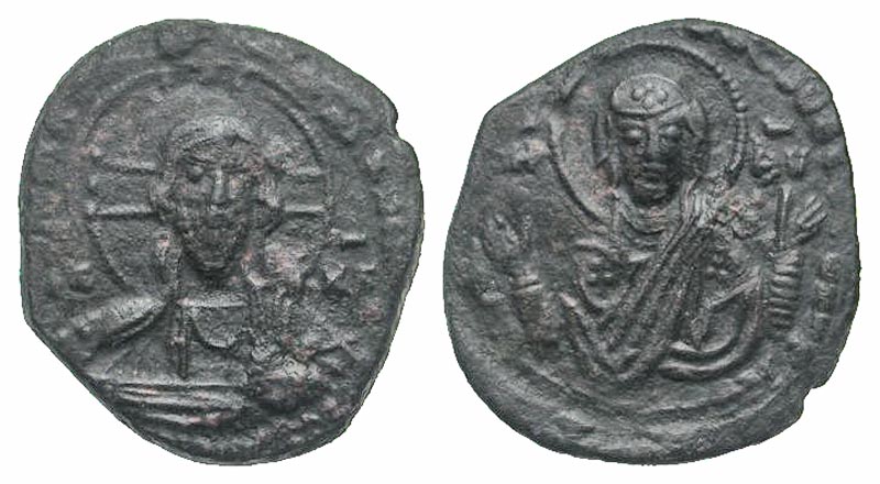 Anonymous (attributed to Romanus IV). Ca. 1068-1071. AE "Class G" anonymous follis (26.1 mm, 5.36 g, 5 h). Constantinople mint. Bust of Christ facing with nimbate cross, pallium and colobium, and raising right hand in benediction, scroll in left hand / MP-ΘV, facing bust of the Virgin Mary, nimbate and wearing pallium and maphorium. SBV 1867; DOC p. 692-4. aVF.