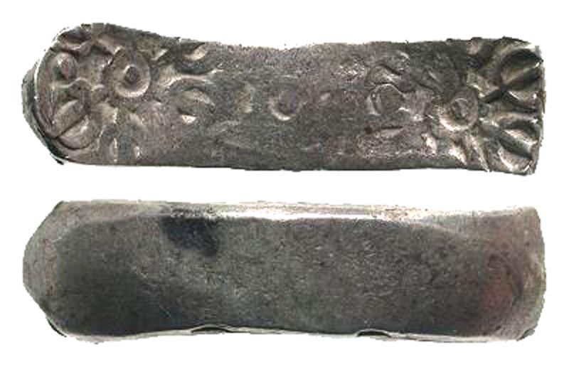 Gandhara. Maha Janapada. 500-300 B.C. AR "Bent Bar' satamana (40x10 mm, 11.20 g). Taxila mint. 2 six-petalled flowers at each end / Blank. Mitchener ACW 4071-7; AIC 1. VF.