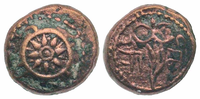 South India, Vijayanagara Dynasty. Rama Deva Raya. 16171632 AD. CE Unit (15.3 mm, 4.28 g, 12 h). Stylized Chakra, The Weapon of Lord Vishnu / A dagger in middle and toward the left moon and sun to right; Devanagri legend Ram. K Ganesh 309. VF, minor deposits. Extremely Rare.