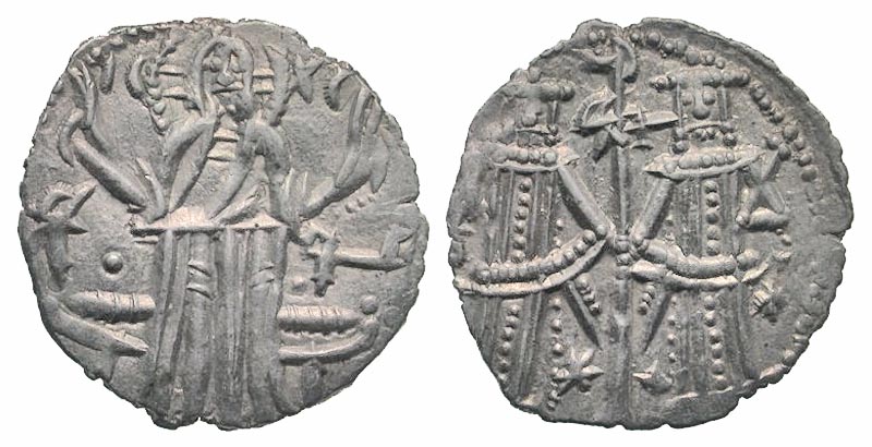 Bulgaria. Ivan Aleksandar and Mikhail Asen. 1331-1355. AR grosh (21.4 mm, 1.66 g, 6 h). Christ standing facing before seat, raising hands in benediction, IC XC and monograms across field / Ivan Aleksandar and Mikhail Asen IV standing facing, each holding cross-tipped scepter, holding Christogram-tipped staff between them; monograms across field; stars flanking base of staff. R&Z 1.13; M&J 9.1.2. EF.