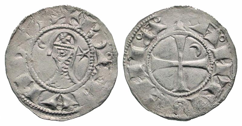 Crusader States, Principality of Antioch. Bohemond III. 1163-1201. BI denier (18.6 mm, 1.04 g, 8 h). struck ca. 1163-1188. + BOAMVИDVS, armored bust left; crescent and star in fields / + AИTIOCИIA, short cross with crescent in 2nd angle. Metcalf 387; CCS 66e. aVF.