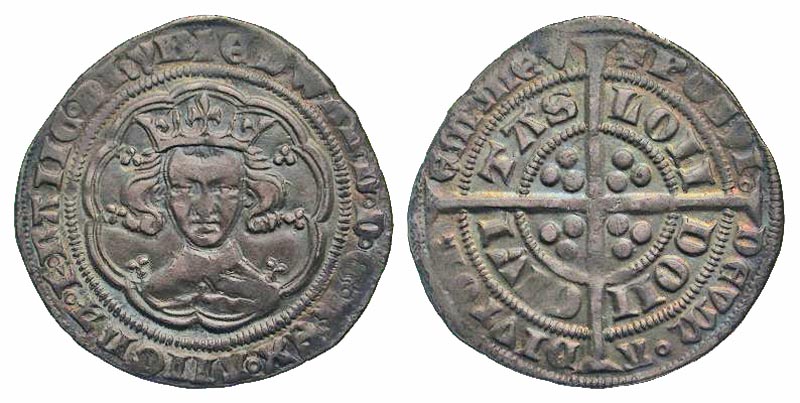 Lot 50-260. England, Plantagenet Kings. Edward III. 1327-1377. AR groat. London mint. mm: cross, Pre-treaty class E, 1354-1355.