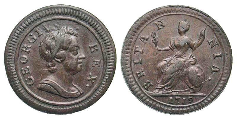 Lot 50-263. British, House of Windsor. George I. 1714-1727. AE farthing. Tower mint (London), dated 1719.
