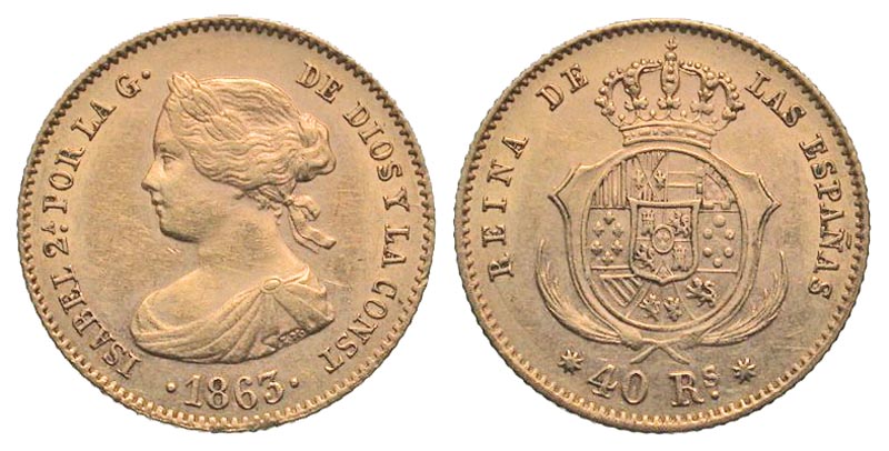 Spain. Isabel II. 1833-1868. AV 40 reales (17.9 mm, 3.36 g, 1 h). Barcelona mint, 1863. ISABEL 2A POR LA G DE DIOS Y LA CONST ·1863·, draped bust left / REINA DE LAS ESPANAS; *40 Rs*, crowned coat of arms. KM 616. EF.