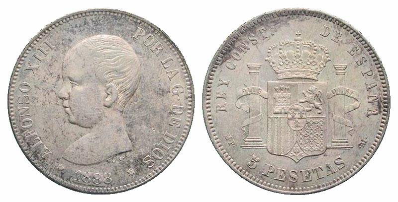 Lot 50-270. Spain. Alfonso XIII. 1886-1931. AR 5 pesetas. Madrid mint, 1888.