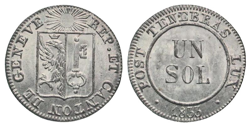 Swiss Cantons, Geneva. 1833. BI 1 sol (17 mm, 0.93 g, 6 h). Arms within circle, sun above / Value, date below. KM 120. Gem BU, lustrous.