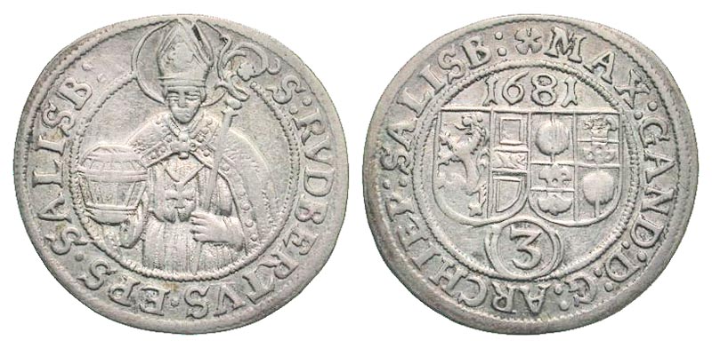 Austria, Salzburg. Maximilian Gandolph Graf von Kuenburg. 1668-1687. AR 3 kreuzer (groschen) (21.2 mm, 1.42 g, 12 h). 1681. St. Rupert, half-length, standing facing slightly left, holding salt box and crozier / Coat of arms. KM 228; Probszt 1687. EF.