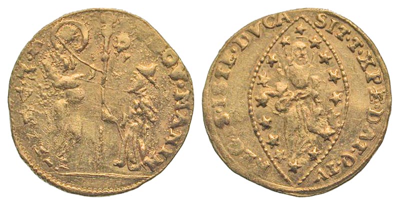 Italian States, Venice. Ludovico Manin. 1789-1797. AV zecchino (20.9 mm, 3.46 g, 3 h). S·M·VENET DVX LVDOV·MANIN, St. Mark standing right, holding the Gospels and presenting cross-tipped scepter to Doge kneeling left / SIT·T·XPE·DAT·Q·TV REGIS·ISTE DVCA, Christ standing facing, holding Gospels and raising hand in benediction, surrounded by mandorla. CNI VIII 69 ; Papadopoli 5; Paolucci 14. VF.