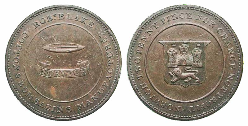 Great Britain, Norfolk. Norwich. ca. 1811. AE 2 penny token (41.2 mm, 44.32 g, 6 h). ROBT BLAKE COTTON & BOMBAZINE MANUFACTURER; NORWICH on banner, shuttle / NORWICH TWO PENNY PIECE FOR CHANGE NOT PROFIT, arms of Norwich. Withers 910. EF, minor nicks. Scarce.