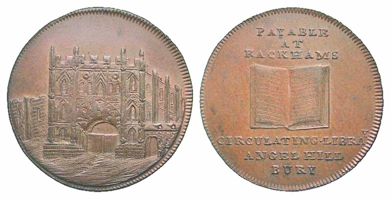 Great Britain, Suffolk. Bury. ca. 1790s. AE 1/2 penny token (28.6 mm, 10.15 g, 5 h). ABBEY GATE BURY, ancient gateway / PAYABLE AT RACKHAMS CIRCULATING LIBRARY ANGEL HILL BURY. Edge: OR AT LEATHERDALE'S HARLSTON NORFOLK, open book. D&H 29. EF.