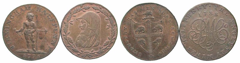 [Medals & Tokens]. Lot of 2 British Conder Tokens. Warwikshire, Birmingham, boy standing // Wales, Anglesey, druid. Both are halfpennies, VF.