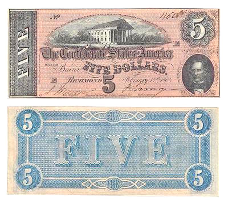 Lot 50-308. Confederate States of America, Richmond, Virginia, $5. Sharp VF, slight smudge on note number.