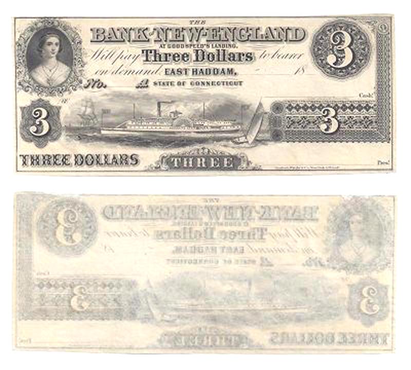 Obsolete Note: The Bank of New England at Goodspeeds Landing, East Haddam, Connecticut, $3. 18xx. Paddlewheel ship / Blank. Remainder; unsigned and undated. Sr. N 86; Haxby CT110-G20a. Crisp uncirculated.