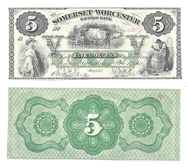 Lot 50-315. Obsolete Note: Somerset & Worcester Savings Bank, Maryland, $5. Crisp uncirculated.