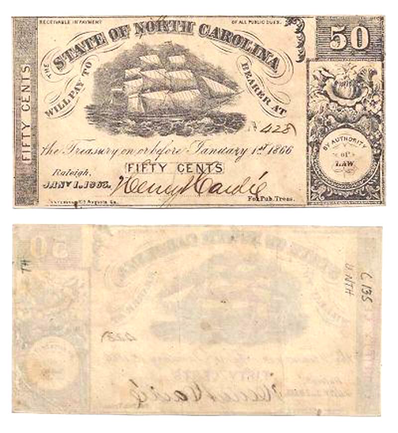 Obsolete Note: State of North Carolina, Raleigh, $.50. Jan.1, 1863, No. 428. Sailing ship / Blank. Cr. 138; Haxby -. Crisp, lightly circulated. No folds.