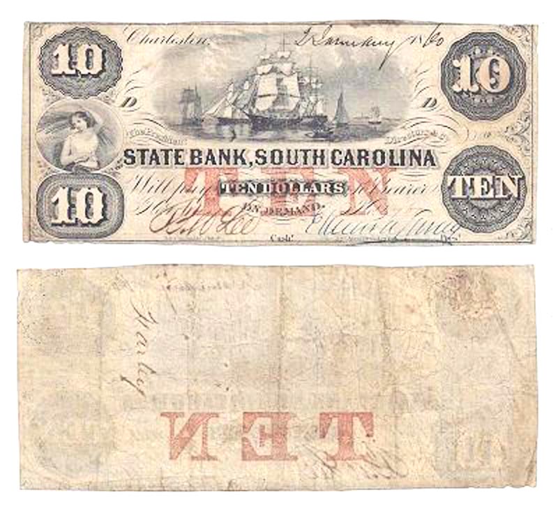 Lot 50-318. Obsolete Note: State of South Carolina, Charleston, $10. Circulated, corner folds.