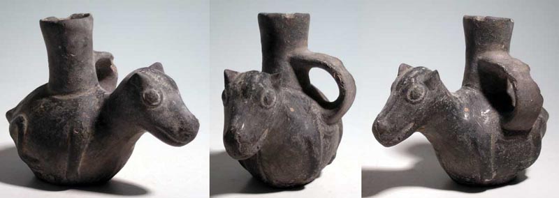 Chimu Llama Bottle from Peru, ca. 1100 - 1450 AD. An adorable Chimu llama effigy vessel from Peru, ca. 1100 - 1450 AD. It is 6 long, has a nicely detailed head, with the legs molded in high relief along the sides of the chamber. Nicely burnished, strong mineral deposits. Ex Cuchi collection. Value range: $300 - $400.