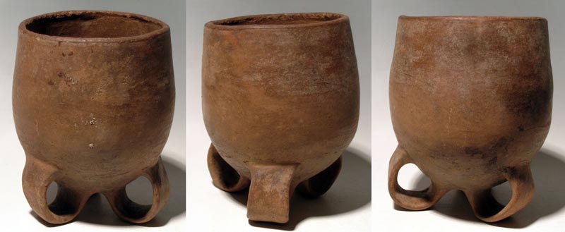 Chiriqui Vessel from Panama, , ca. 1000 - 1500 AD. A large Chiriqui tripod vessel from northern Panama, ca. 1000 - 1500 AD. It is 8" high and stands on a trio of large loop legs. Intact, with strong mineral deposits. Ex Crouch estate. Value range: $200 - $400.