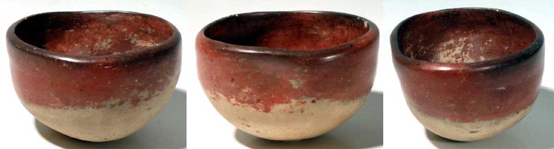 Chupicuaro Libation Bowl from Mexico, ca. 400 - 100 BC. A lovely kidney-shaped Chupicuaro libation vessel from Mexico, ca. 400 - 100 BC. It is 5-1/4" in diameter, with one side indented to create a thumb hold, similar to Olmec “helmet” bowls. This red-rimmed bowl is a transitional type of the red-on-buff variant. The upper section and most of the interior is covered with a highly burnished, deep red slip; the remainder is smooth white clay. In excellent condition with nice dendrites. Ex Selman estate. Value range: $175- $300.