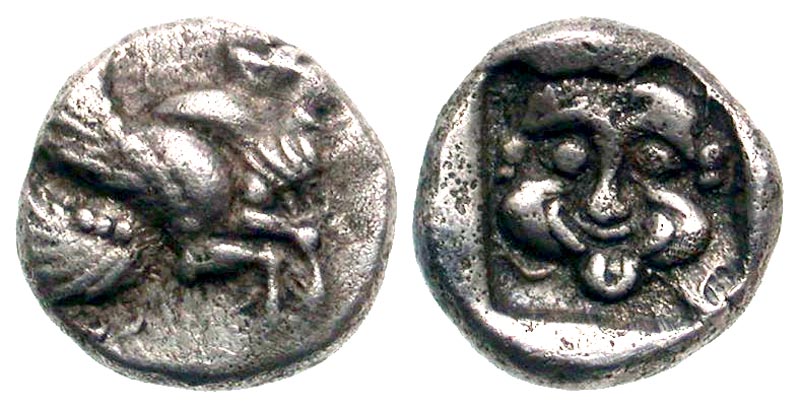 Lycian Dynasts. Uvug(?). Ca. 470-440 B.C. AR diobol (10.5 mm, 1.47 g, 1 h). Forepart of winged bull right / Facing gorgoneion within incuse square. Vismara 95; SNG von Aulock 4101. EF.