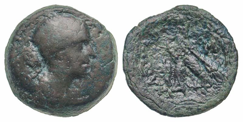 Ptolemaic Kingdom. Cleopatra VII Thea Neotera. Ca. 37/6 B.C. AE obol - 40 drachmae (20.1 mm, 8.38 g, 11 h). Alexandria mint. Diademed and draped bust right / BACIΛICCHC KΛEOΠATPAΣ, eagle standing left on thunderbolt; double cornucopia to left, M in right field. Svoronos 1872; SNG Copenhagen 422-4; Weiser 184-5. aVF. Rare.