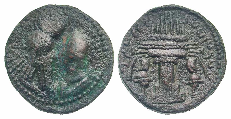 Sasanian Kingdom. Ardashir I. A.D. 223/4-240. AE tetradrachm (27.2 mm, 10.00 g, 7 h). phase 3b, ca. A.D. 233/4-238/9. Crowned bust of Ardashir I on left vis a vis crowned bust of Shapur I on right / Fire altar with ribbons; censers below. SNS Type VIII/3a; Göbl VII/2; Sellwood 11. VF. Rare.